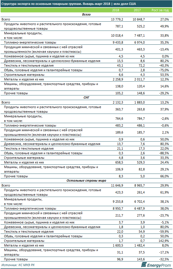 Основная экспортная позиция РК — топливно-энергетические товары (нефть, газ, и т.д.): более 10 млрд долл, на 33,8% больше, чем годом ранее. Причем 92,4% экспорта в секторе пришлось на страны мира, не входящие в СНГ, в основном — страны Европы.