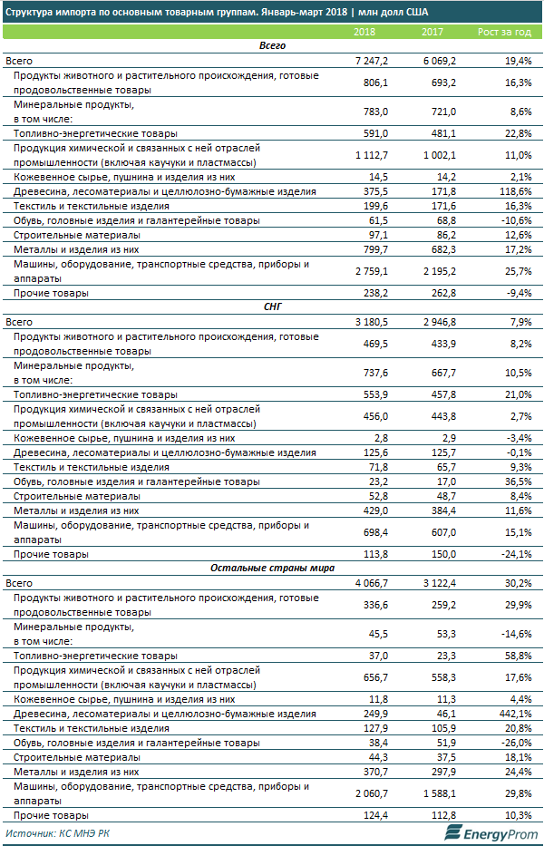 Главные импортные позиции — транспортные средства, машины и оборудование (2,8 млрд долл, +25,7% за год), продукция химпрома (1,1 млрд долл, +11% за год), и продовольственные товары (806,1 млн долл, +16,3% год-к-году).