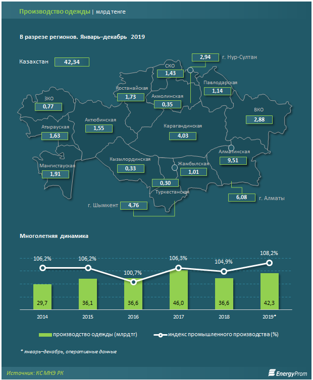 За прошедший год в Казахстане произвели одежды на 42,34 млрд тенге — на 19,8% больше, чем годом ранее (за 12 месяцев 2018 года показатель составлял 35,34 млрд тг)*. С учётом инфляции реальный рост промышленного производства составил 8,2%.