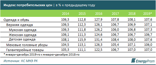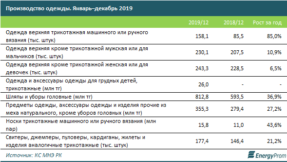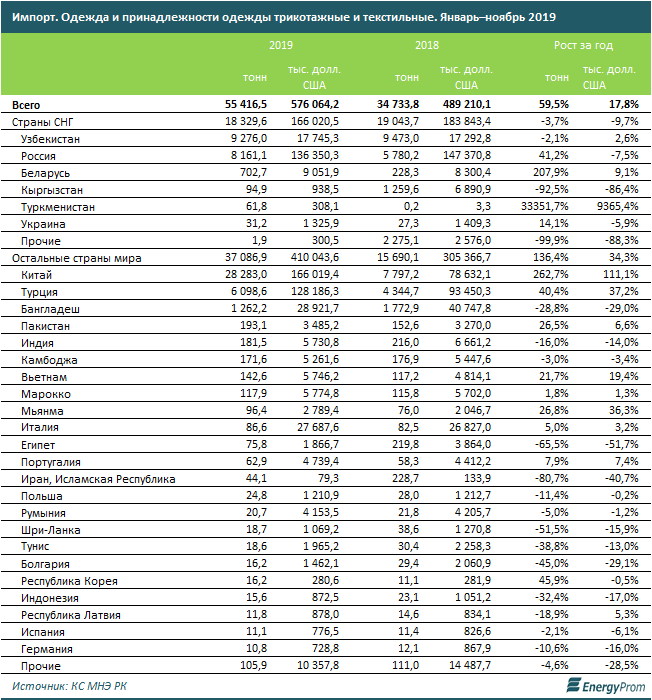 За январь–ноябрь 2019-го в Казахстан импортировали одежды и принадлежностей одежды из трикотажа и текстиля на 576,1 млн долл. США (55,4 тыс. тонн) — сразу плюс 17,8% за год в деньгах, и плюс 59,5% — в весе.