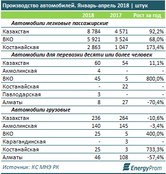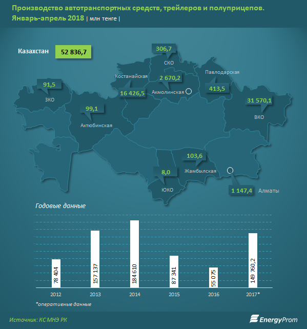 Основное производство (почти 91%) сконцентрировано в ВКО (31,6 млрд тг, в 2,3 раза больше, чем годом ранее) и Костанайской области (16,4 млрд тг, +67,6%). Здесь работают главные автомобилестроители страны — «Азия Авто» и «СарыаркаАвтоПром».