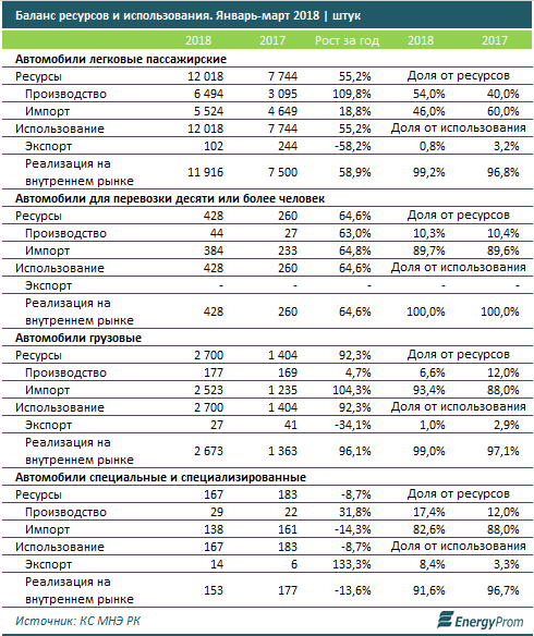 По итогам I квартала импорт занимал 46% спроса на легковые авто (против 60% годом ранее), 89,7% спроса на автобусы и прочие машины для перевозки более 10 пассажиров, 93,4% рынка грузовых авто и 82,6% — спецавтомобилей.