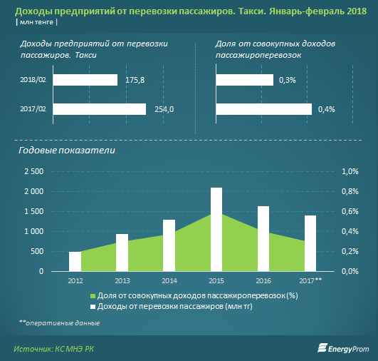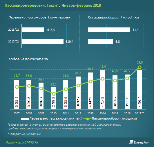 За 2 месяца таксисты перевезли 615 миллионов пассажиров — на 0,7% меньше, чем годом ранее. Таким образом, исходя из данных комитета по статистике, каждый трудоспособный казахстанец совершает ежедневно в среднем 1,2 поездки на такси.
