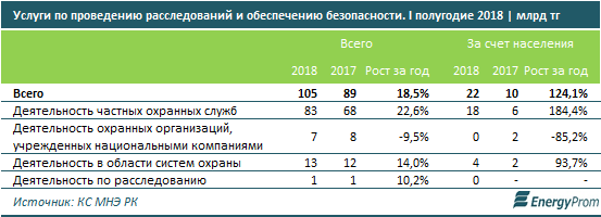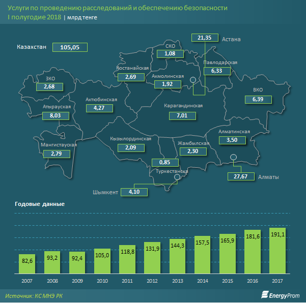 Объемы услуг по проведению расследований и обеспечению безопасности в РК выросли год-к-году сразу на 18,5%, и достигли по итогам I полугодия уже 105,1 млрд тг.