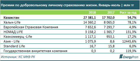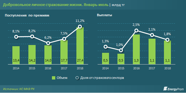 Премии по добровольному страхованию жизни за январь-июль текущего года составили 27,4 млрд тг, что на 54,7% больше, чем в прошлом году. При этом всего премии в страховом секторе выросли лишь на 3,8%, до 245,2 млрд тг. В итоге доля премий по добровольному страхованию жизни выросла за год с 7,5% до 11,2% от всех премий в РК.