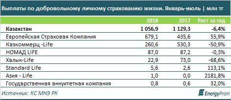На втором месте «Казкоммерц-Life» — 260,6 млн тг, что на 50,9% меньше, чем в прошлом году. Замыкает тройку лидеров «Номад Life» — 87 млн тг, на 0,3% меньше, чем за январь-июль 2017 года.