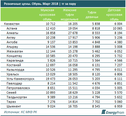 Женские туфли подорожали год-к-году на 6,8%, до 16,2 тыс. тг, девичьи — на 7,1%, до 5,8 тыс. тг, детская кроссовая обувь — сразу на 9,5%, до 6 тыс. тг.