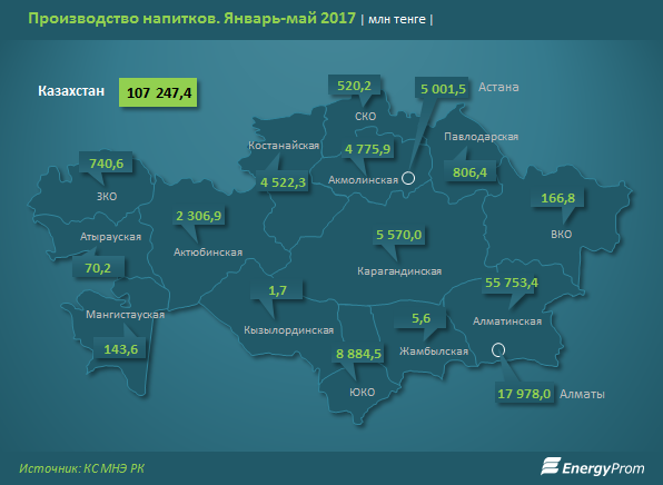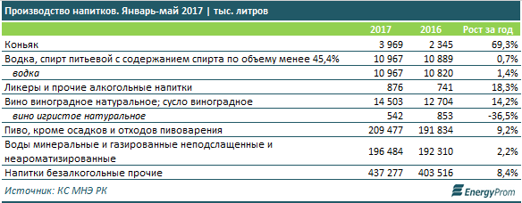 Казахстанские производители по итогам января-апреля 2017 обеспечили 85,2% спроса на водку и ликероводочные изделия, 96% спроса на коньяк и коньячные напитки, 60,6% — на вина, 89,4% — на пиво и 94,9% — на минеральную воду и безалкогольные напитки.