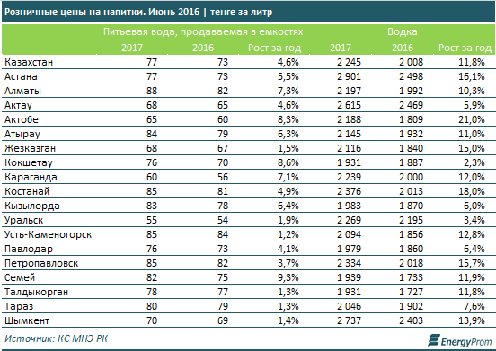По итогам июня цены на питьевую воду выросли на 4,6% за год, до 76,8 тг за литр. Дороже всего бутилированная вода обходилась жителям Алматы (88 тг за л, +7,3% за год).