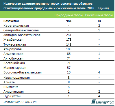 Количество административно-территориальных объектов в РК, газифицированных природным газом, достигло 984 единиц, сниженным — 14. Самые высокие показатели по газификации природным газом ожидаемо отмечены в Западно-Казахстанской области: 231 объект. Среди лидеров также Жамбылская (178 пунктов) и Туркестанская (148 объектов) области.