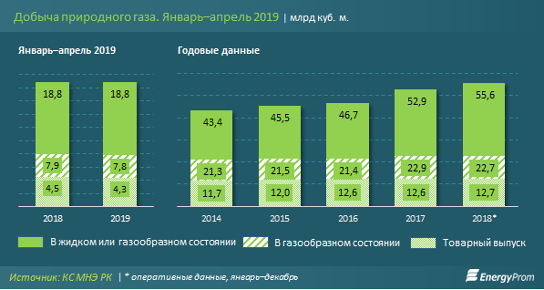 Напомним, добыча природного газа в жидком или газообразном состоянии за январь–апрель текущего года незначительно выросла в сравнении с аналогичным периодом прошлого года и составила 18,8 млрд куб. м, из них естественный газ в газообразном состоянии составил 7,8 млрд куб. м, товарный выпуск газа — 4,3 млрд куб. м.