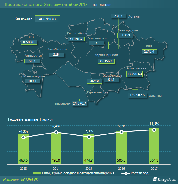 На Алматы и прилегающую область за январь–сентябрь 2018 года пришлось 62,2% производства от РК. В Алматы прирост составил всего менее 1% год-к-году, до 156 млн литров; в области — 6,5%, до 134 млн литров.