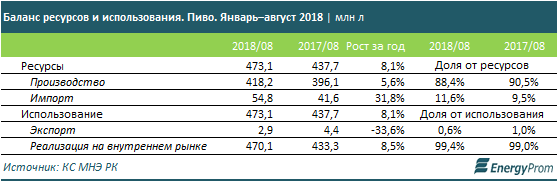 Тем временем вместе с ростом производства растёт и импорт пива: в январе–августе 2018 года объёмы ввоза пенного напитка подскочили сразу на 31,8%. Впрочем, это лишь 11,6% спроса, в то время как более 88% перекрывает собственное производство.