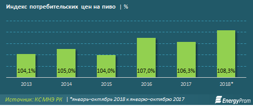 За 2017 год цены на пиво поднялись относительно 2016-го на 6,3%. По итогам 10 месяцев 2018-го годовое удорожание подбросило цены на пиво ещё на 8,3%.