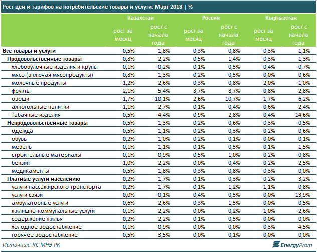 По итогам марта рост цен и тарифов для населения РК составил 0,5% к февралю и 1,8% — с начала года*. Для сравнения, в странах-соседях по ЕАЭС уровень инфляции ниже: в России рост цен за месяц составил 0,3%, к декабрю 2017 года — 0,8%, в Кыргызстане — с начала года 1,1%, за месяц же цены на товары и услуги снизились на 0,3%.