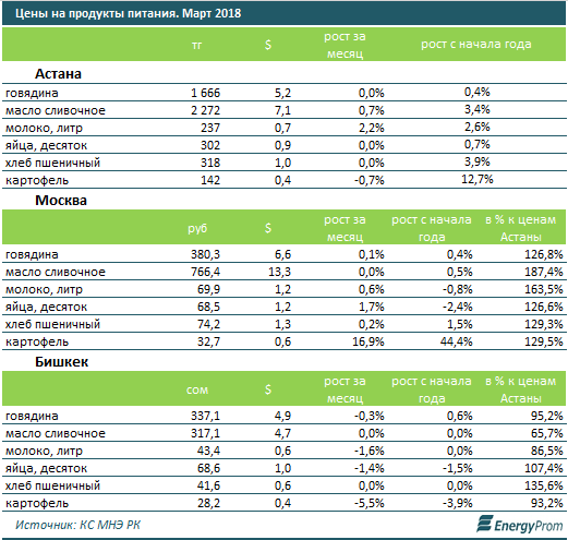Примечательно, что яйца и хлеб стоили в столице Казахстана дешевле, чем в обеих столицах стран-соседей по таможенному союзу: яйца — 302 тг за десяток, на 26,6% меньше, чем в Москве, и на 7,4% меньше, чем в Бишкеке; хлеб — 318 тг за кг, на 29,3% меньше, чем в Москве, и сразу на 35,6% меньше, чем в Бишкеке.