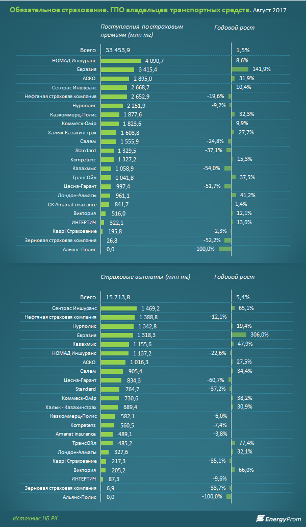 За январь-август страховые компании собрали премии в сегменте обязательного страхования гражданско-правовой ответственности автовладельцев в размере 33,5 млрд тг — это на 1,5% больше, чем в аналогичном периоде годом ранее. Лидируют объемами собранных премий «Номад Иншуранс» — 4,1 млрд тг, +8,6% за год, «Евразия» — 3,4 млрд тг, годовой рост — сразу в 2,4 раза, и «Аско» — 2,9 млрд тг, +31,9% за год.