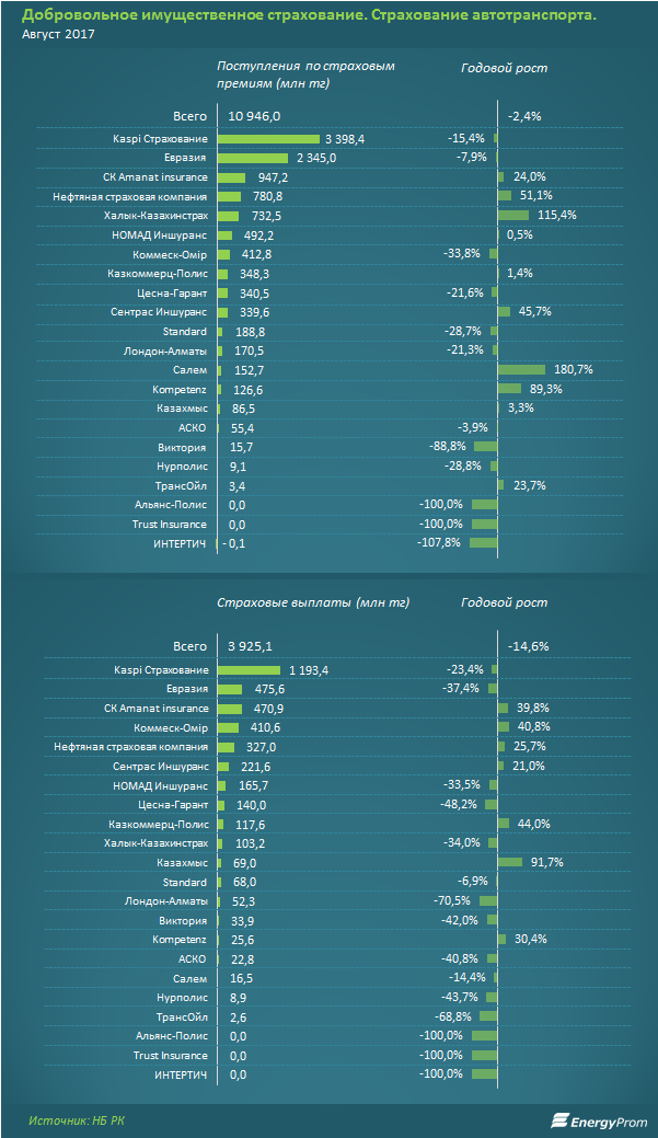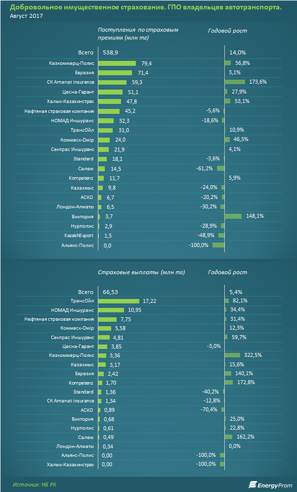 Примечательно, что, переживая об ущербе, который может быть нанесен чужим транспортным средствам пострадавших, им самим или другому их имуществу, автовладельцы РК в то же время проявили меньше заботы о собственных автомобилях. Так, в сегменте добровольного страхования автотранспорта объем страховых премий, собранных компаниями, снизился год-к-году на 2,4%, до 10,9 млрд тг. Среди лидеров по поступлениям страховых премий — «Kaspi Страхование», «Евразия» и «Amanat insurance».