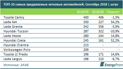 Среди легковых моделей пятый месяц подряд лидирует Toyota Camry — 400 проданных авто; на второй позиции Lada 4х4 (350 машин), тройку замыкает Lada Granta (342). На четвёртой строчке Hyundai Tucson — 287 кроссоверов. Далее по списку: Lada Vesta (280), Hyundai Creta (245), Hyundai Elantra (213), Volkswagen Polo (209), Toyota Land Cruiser Prado и Lada Largus — по 196 авто.