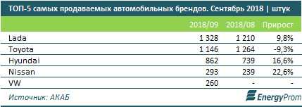 По данным Ассоциации казахстанского автобизнеса (АКАБ), в сентябре автомобильный рынок страны продолжил рост, хотя и менее высокими темпами. Продажи новых автомобилей в сентябре 2018-го увеличились на 2,7% по сравнению с августом текущего года: казахстанские дилеры продали 5,4 тысячи легковых автомобилей и лёгкой коммерческой техники, а также 305 единиц грузовиков, спецтехники и автобусов.