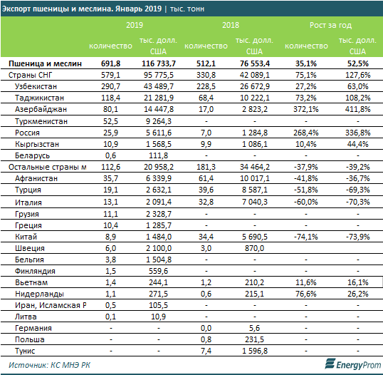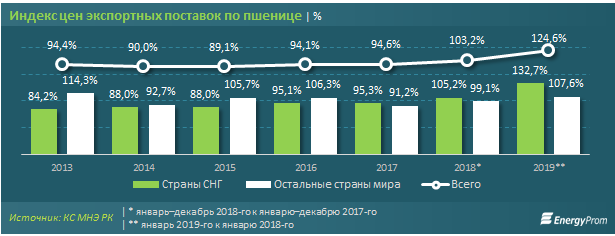 Экспортные цены на казахстанскую пшеницу для стран СНГ за январь 2019 года выросли на 32,7%, для остальных стран мира — на 7,6%. В целом по итогам первого месяца текущего года экспортные цены на пшеницу увеличились на 24,6%.