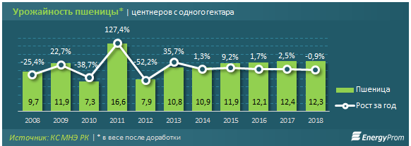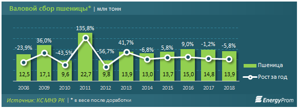Валовой сбор пшеницы в 2018 году снизился по сравнению с 2017 годом на 5,8% и составил 13,9 млн тонн. Ранее — в 2017 году — валовой сбор пшеницы также снизился: на 1,2%, до 14,8 млн тонн.