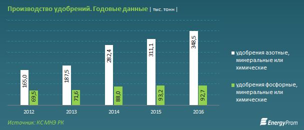 Производство фосфорных удобрений в 2016 году напротив, немного сократилось (-0,5% по итогам года к показателям 2015) — крупнейший завод отрасли «Казфосфат» находился на реконструкции и модернизации в рамках ГПИИР, что и позволило резко увеличить объемы выпуска в текущем году.