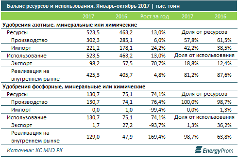 Экспорт фосфорных удобрений по оперативным данным КС МНЭ РК сократился до всего 1,7 тыс. тонн. Впрочем, судя по всему, уточненные годовые данные покажут другую картину: в ходе визита премьер-министра Бакытжана Сагинтаева на завод в ноябре текущего года, генеральный директор ТОО «Казфосфат» Мукаш Искандиров рассказал, что в 2017 году предприятием было произведено 300 тысяч тонн фосфорных минеральных удобрений, из которых на внутреннем рынке реализовано 108 тысяч тонн. Еще около 200 тысяч тонн экспортируется в Китай, Афганистан, Россию, Украину, Уругвай и Аргентину. Проводится работа по освоению рынков Румынии, Чехии, Болгарии и Ирана. В следующем году реконструированный завод планирует увеличить объемы производства до 500 тысяч тонн фосфорных минеральных удобрений.