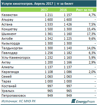 Дороже всего посещения кинотеатров обходились кинолюбителям Атырау (1600 тг за билет) и Астаны (1533 тг за билет, +7,5% за год).