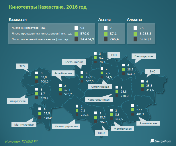 К началу текущего года в стране работало 94 кинотеатра (+1 за год). Наибольшее количество сконцентрировано в культурной столице — 25 кинотеатров (26,6% от РК). По 8 кинотеатров работает в Карагандинской и Мангистауской областях, 7 — в Астане.