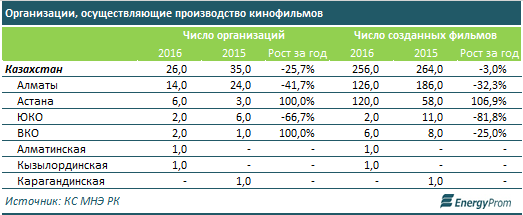 В прошлом году в РК насчитывалось 26 компаний, производящих фильмы (-25,7% год-к-году), которые создали 256 кинолент (-3% за год).