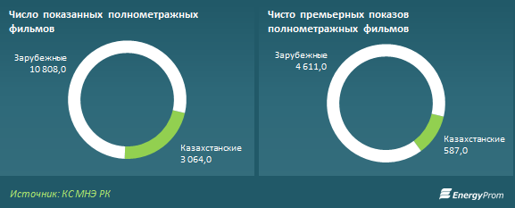 За прошедший год в кинотеатрах было показано 13,87 тысячи полнометражных фильмов, из которых 22,1% — казахстанские. При этом премьерные показы заняли 37,5% (5,2 тысячи кинолент), из них всего 11,3% — казахстанские.