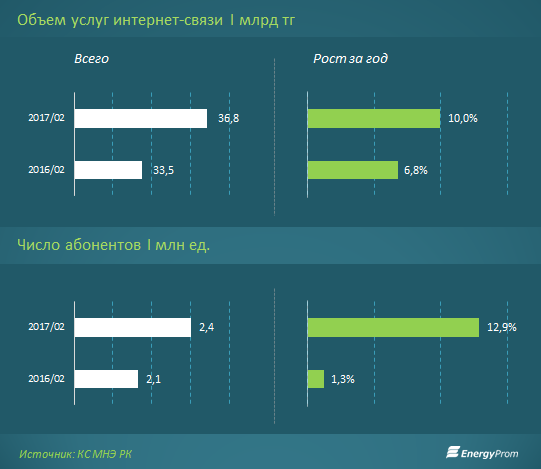 За январь-февраль 2017 интернет-провайдеры оказали казахстанцам услуги на 36,8 миллиарда тенге — на 10% больше, чем в аналогичном периоде прошлого года. Из них 30% было оказано предприятиям.