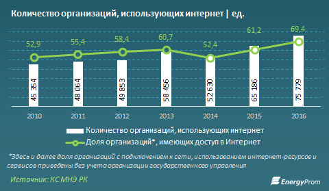 Уровень интернетизации достиг в прошлом году рекордного показателя: так, в 2015 году среди частных компаний доступ к интернету имели лишь 61,2%, в 2014 — 52,4%. В условиях повсеместной цифровизации экономики, ускоренная технологическая модернизация и интернетизация — один из ключевых приоритетов третьей волны модернизации РК. Вопрос развития IT-сферы, коммуникаций, и повсеместный доступ к оптоволоконной инфраструктуре правительство будет держать на особом контроле.