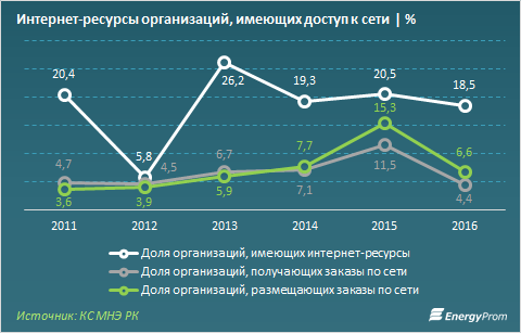 Получали заказы через сеть 4,4% компаний (против 11,5% в 2015 году), размещали заказы в интернете — 6,6% (против 15,3% годом ранее).