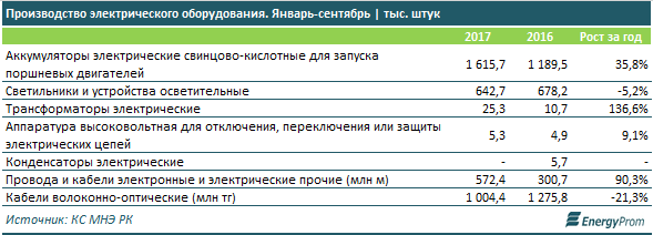 По итогам трех кварталов, производство электрического оборудования в РК выросло на 37,2% год-к-году, до 85,9 млрд тг. С учетом инфляции (в сопоставимых ценах) годовой рост составил 32,1%.