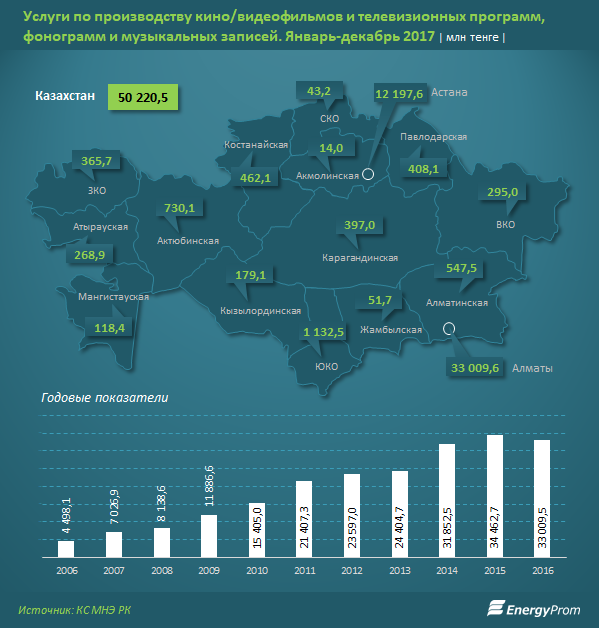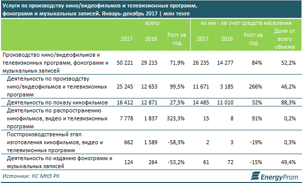 За январь-декабрь 2017 года объем услуг по производству кино/видеофильмов, а также телевизионных программ, фонограмм и музыкальных записей составил уже 20,2 миллиарда тенге — сразу на 71,9% больше, чем годом ранее*.