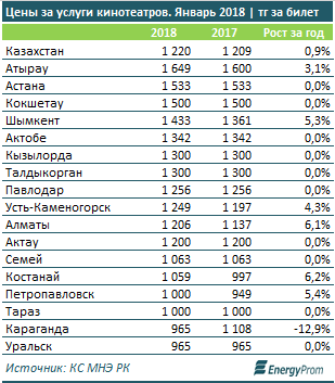 Билеты в кино обходились казахстанцам в среднем в 1220 тенге по итогам января текущего года — это всего на 0,9% больше, чем годом ранее.