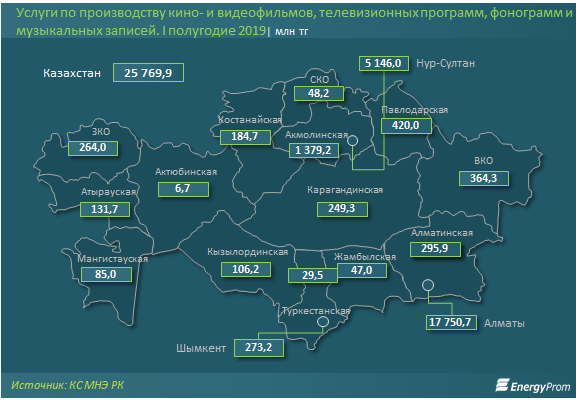Заметим, на культурную столицу, Алматы, всё ещё приходится наибольший объём услуг в секторе, но отмечен спад: 68,9% от РК, против 69,7% годом ранее — это 17,8 млрд тг, против 18 млрд тг в I полугодии 2018-го.