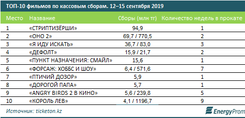 Тройку лучших за 12–15 сентября составили зарубежные фильмы: американская комедия «Стриптизерши» (новинка), вторая часть триллера «Оно», также американского производства, и комедийные ужасы «Я иду искать», также творение Голливуда.