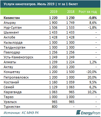 Самые дорогие билеты традиционно приходится покупать любителям кино в Атырау (1900 тг за билет, +8,6% за год), Нур-Султане (1506 тг за билет, −1,8% за год) и Шымкенте (1433 тг за билет).