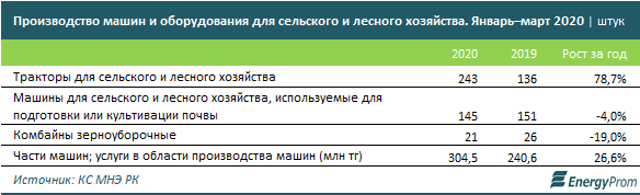 В первом квартале текущего года в стране произвели 243 трактора для сельского и лесного хозяйства (против 136 годом ранее), 145 машин для подготовки и культивации почвы (против 151 годом ранее) и 21 комбайн. Кроме того, было выпущено частей сельхозмашин и оказано услуг в сегменте их производства на 304,5 млн тг (против всего 240,6 млн тг годом ранее). Таким образом, несмотря на ЧП в Казахстане в связи с пандемией COVID-19, производство по основным категориям или в заметном плюсе, или в незначительном минусе относительно прошлогодних показателей.