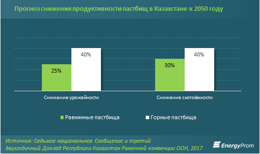 В результате, несмотря на сравнительно малый вклад Казахстана в общий объём выбросов парниковых газов, изменения климата скажутся на нашей стране. Согласно прогнозам климатологов, ожидается снижение урожайности пастбищ и ряда сельскохозяйственных культур, наблюдается угроза сокращения доли лесов и потери части биоразнообразия.