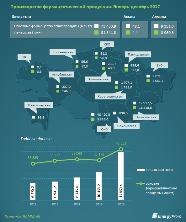За прошедший год казахстанский фармпром выпустил основных фармпродуктов на 73,4 миллиарда тенге — сразу на 73,1% больше, чем годом ранее*.