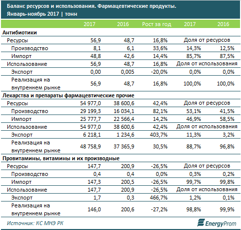 По итогам 11 месяцев 2017 года казахстанские фармкорпорации обеспечили спрос на антибиотики — всего на 14,3%, однако на прочие лекарства и фармацевтические препараты — сразу на 53,1% (против 41,5% годом ранее). В то же время, витамины и их производные в РК практически не выпускаются.