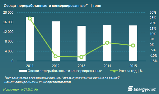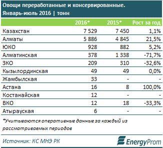 Компании по переработке и консервированию фруктов и овощей выпустили продукции на 44,1 млрд тг за январь-июль 2017, что на 7,7% больше, чем в аналогичном периоде годом ранее. Для сравнения, показатели первых 7 месяцев 2015 обгоняли объемы 2014 всего на 0,03%.