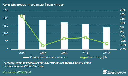 В сегменте фруктовых и овощных соков отмечено снижение выпуска год-к-году на 3,6%, до 74,9 млн литров за январь-июль 2016.