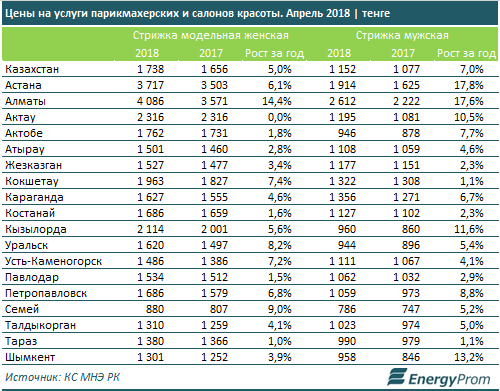 По итогам апреля стрижки обходились казахстанским мужчинам в 1152 тг (на 7% больше, чем годом ранее), женщинам — в 1656 тг (на 5% дороже, чем год назад).