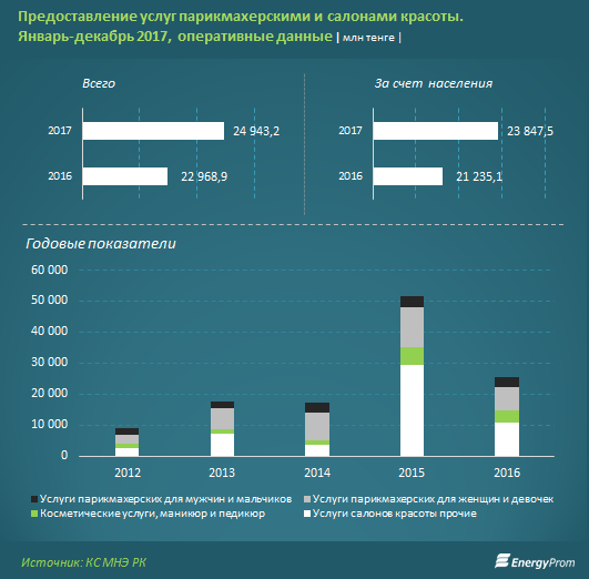 За прошедший год парикмахерские и салоны красоты оказали клиентам услуг на 24,9 млрд тг — на 8,6% больше, чем годом ранее*. Из них услуги за счет населения составили 23,8 млрд тг — на 12,3% больше, чем год назад.
