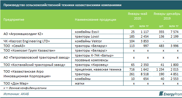 За 5 месяцев 2020 года казахстанские производители сельскохозяйственной техники выпустили 825 тракторов и 139 комбайнов (рост составил 54% за год).